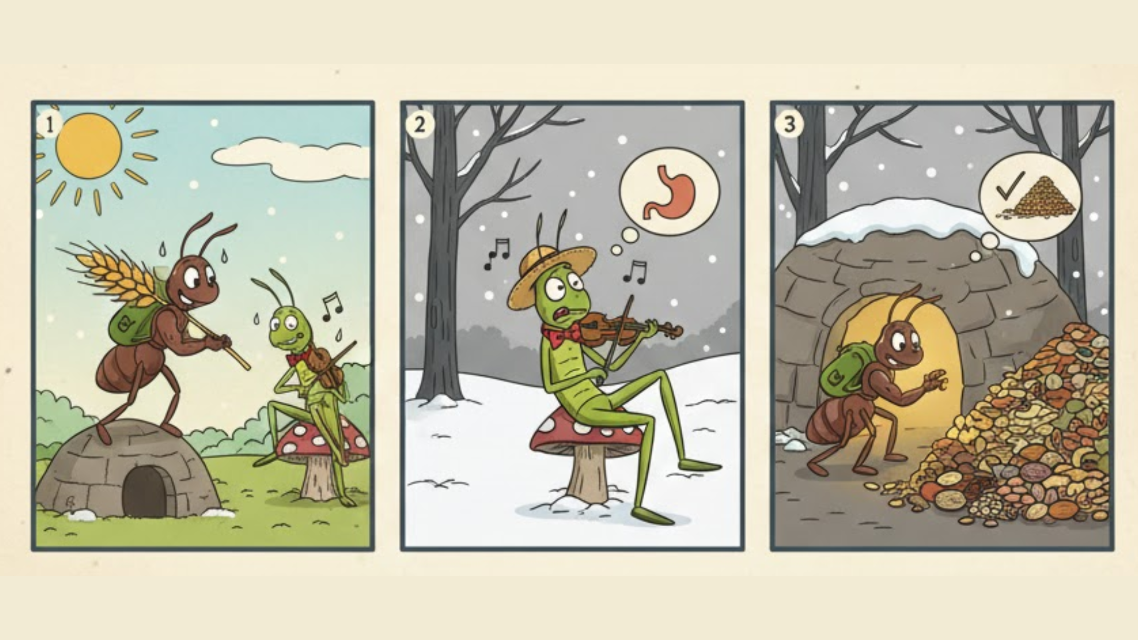 While the ant works hard to store food for the winter with a lot of daily hard work, the grasshopper sings and plays and basically enjoys his life. When winter comes, the grasshopper has nothing to eat and survive on, while the ant is well-prepared.