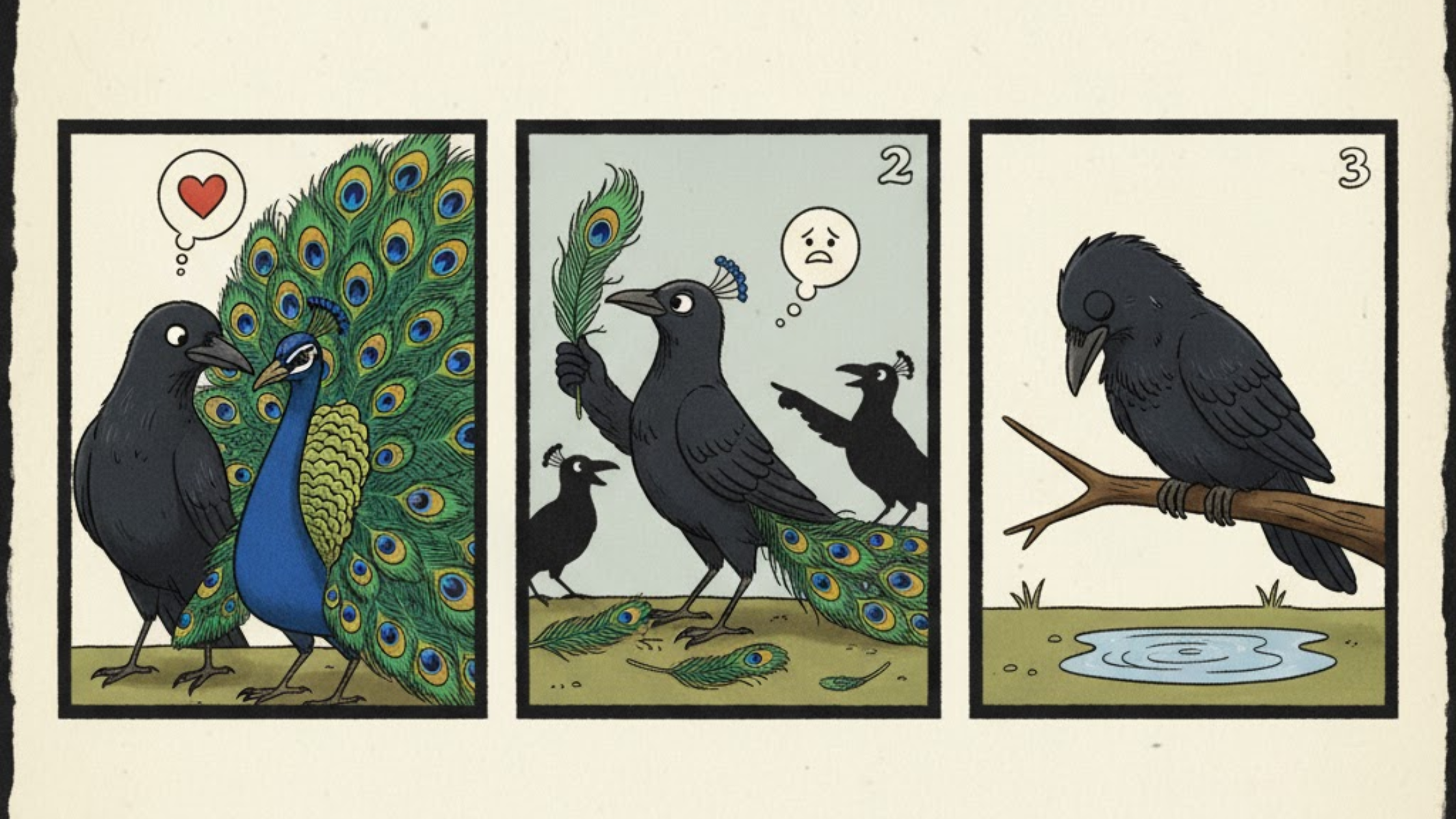 A crow admired a peacock’s feathers as he looked so beautiful and had multiple colours and he thinked to abandoned its own and change with peackcock feathers, only to regret it as everyone made fun on him.