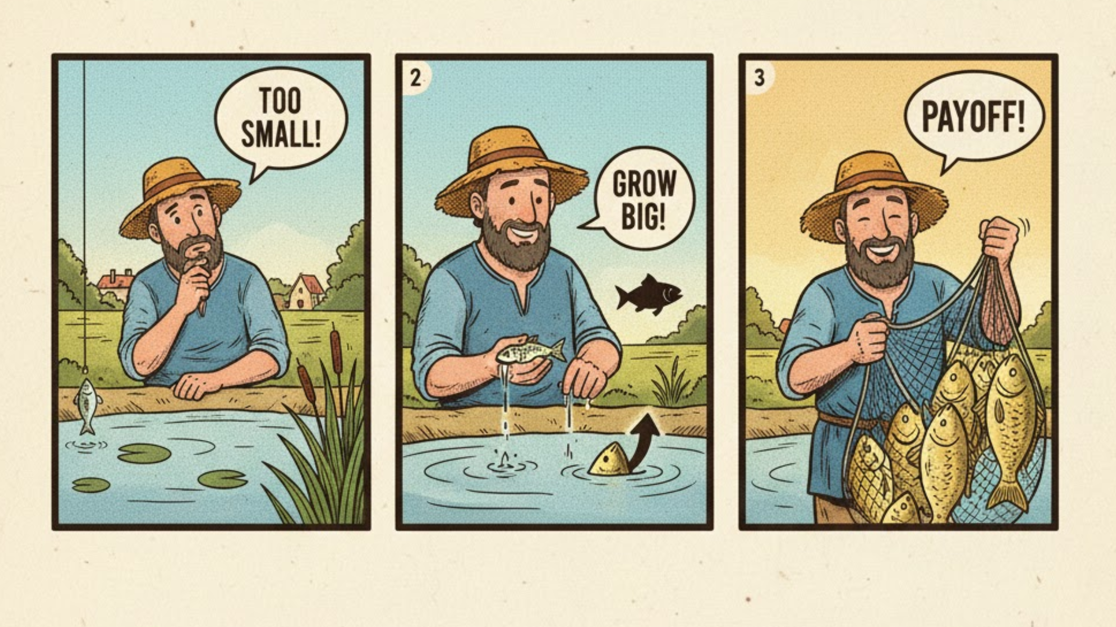 There was a fisherman in a village who used to catch fish daily from the pond. One day he thinks that fish take time to grow, as he was getting all small fish. A fisherman let a small fish go, realizing it would grow bigger, and he would catch a few at a time.