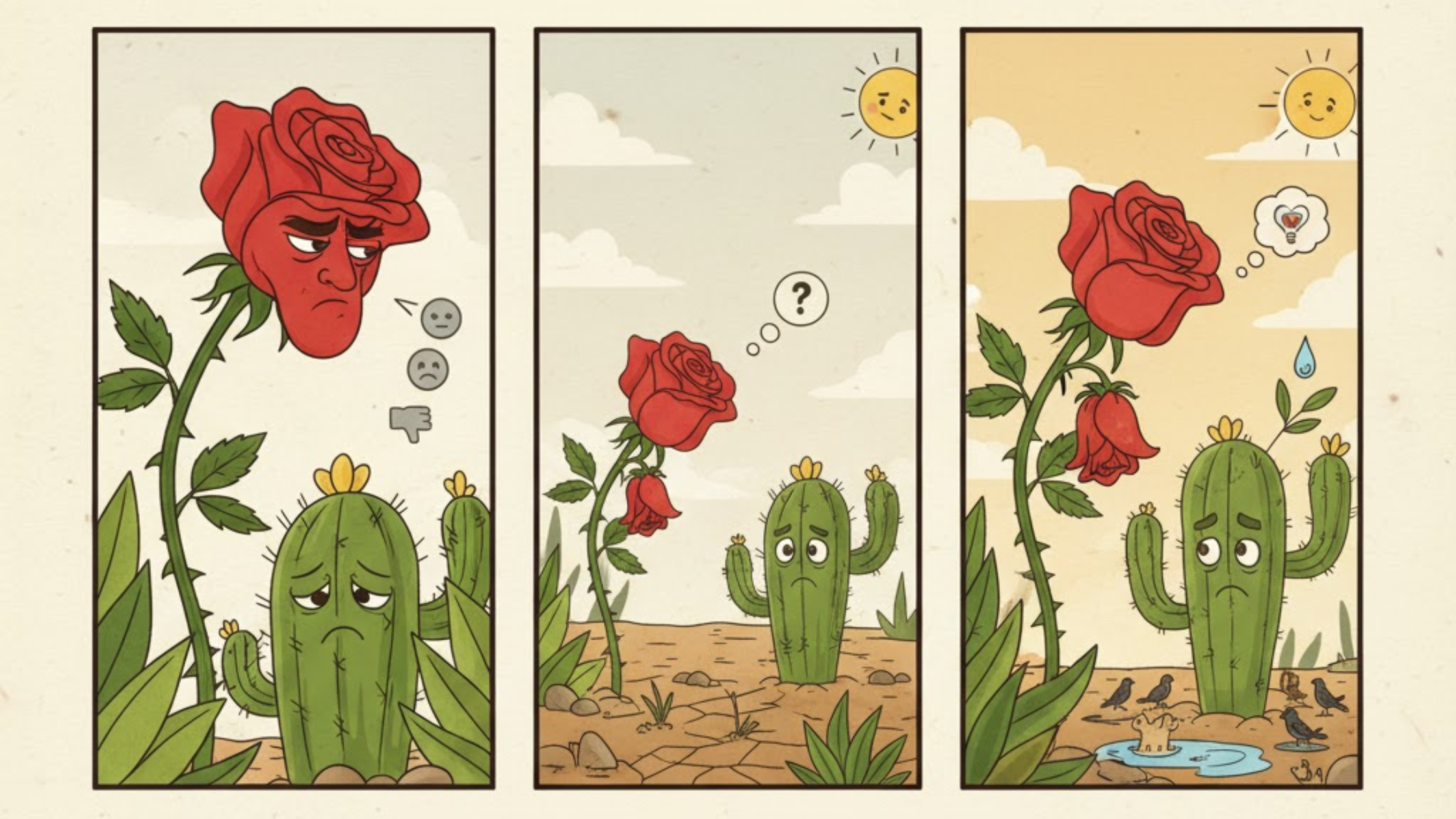A beautiful rose in the desert mocks a cactus for being unattractive. He always used to make fun of him and pass negative comments on his appearance. When water becomes scarce and every plant is in trouble, the rose realizes that the cactus is providing life to others, while it stays dry.