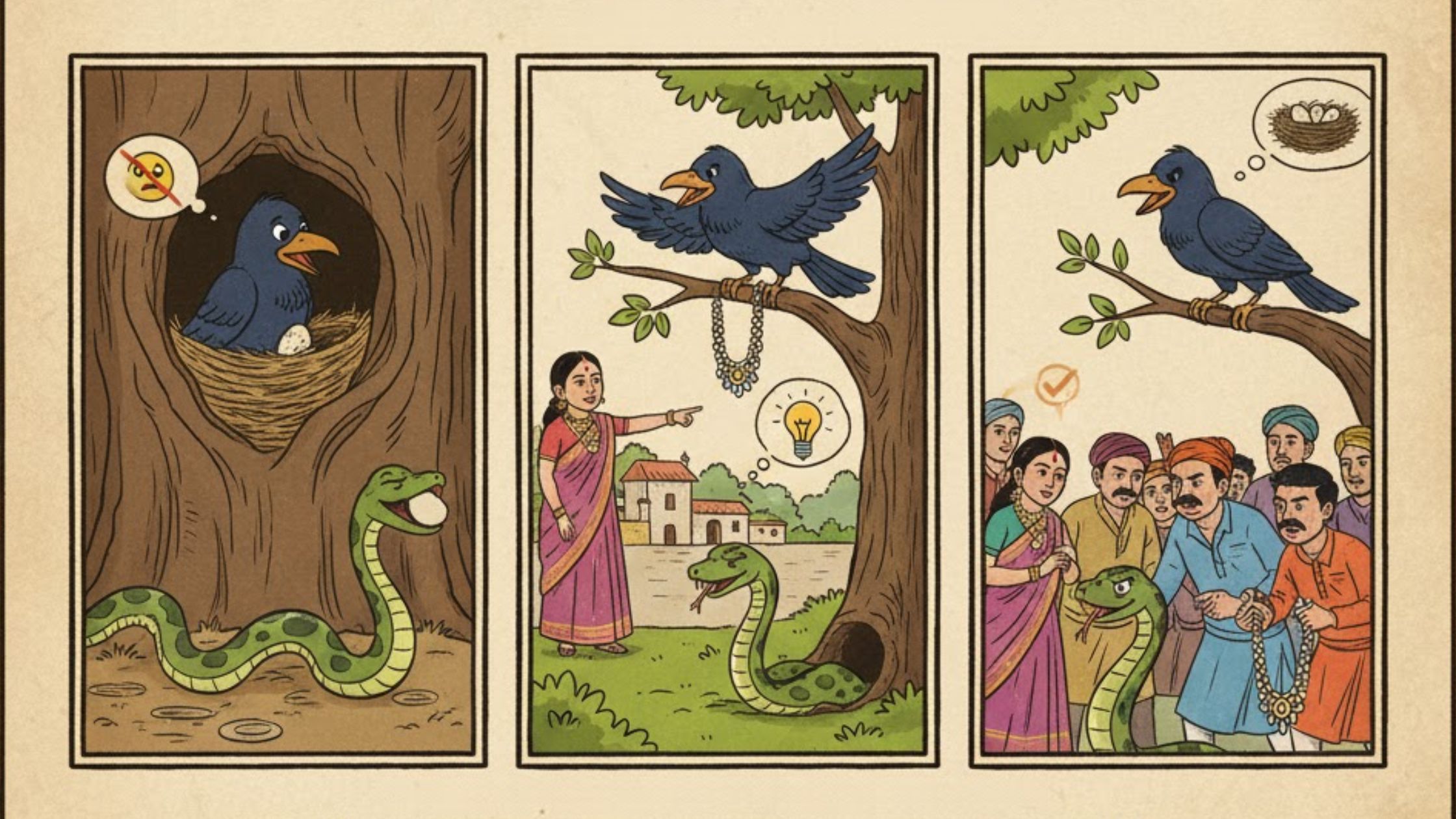 A snake kept eating a crow’s eggs secretly. The crow used to cry as her eggs were getting missed every time, one day she noticed a snake eating her eggs. The crow used her brain and found a shiny necklace and dropped it near the snake’s hole. When people came to find their necklace, they caught the snake, and the crow’s eggs were safe for a lifetime.