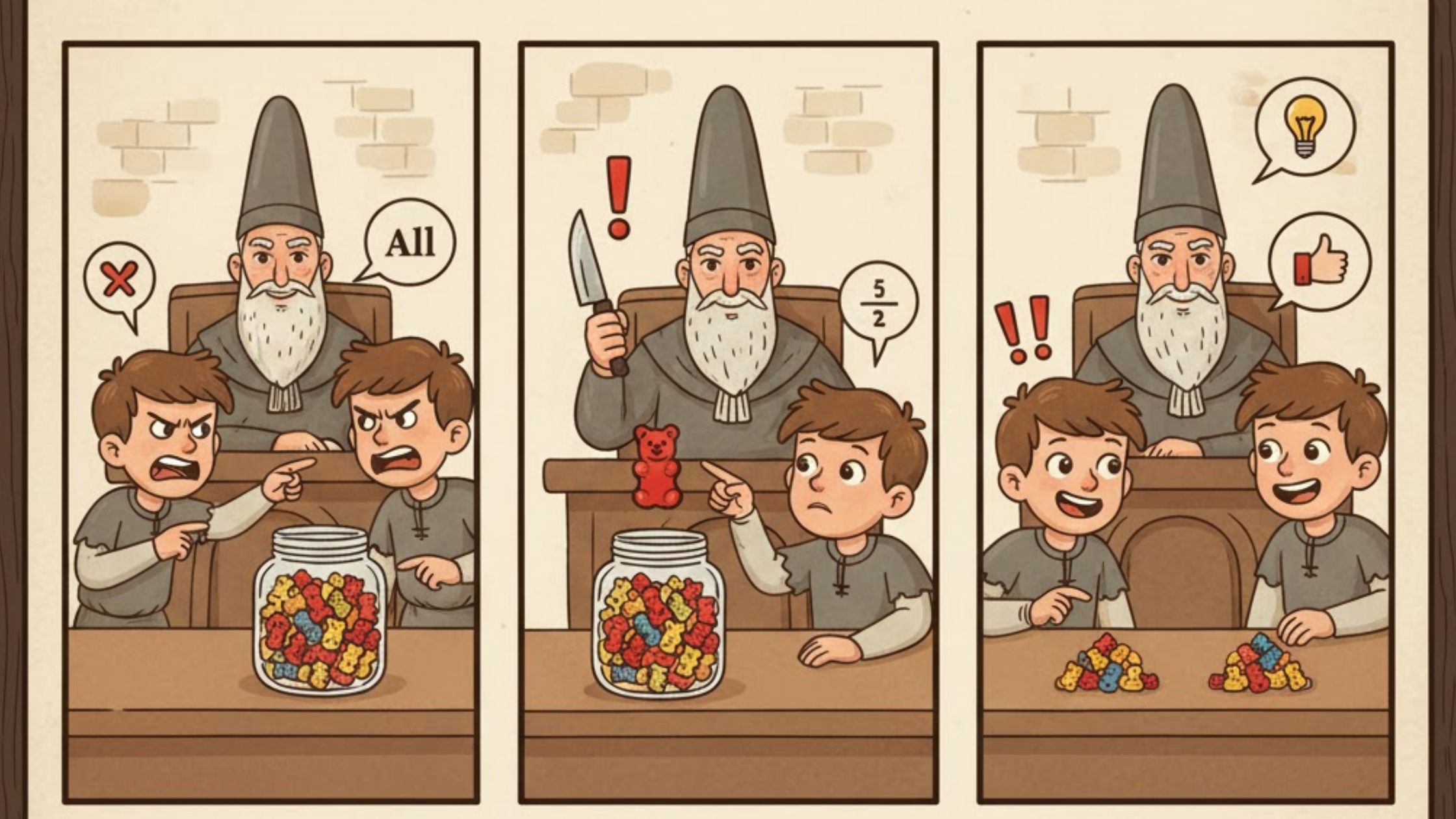 In a village, there were two brothers fighting for gummies. One said we will eat all, and the second brother said he is open to sharing but not all. A judge resolved a dispute by being impartial and thoughtful.