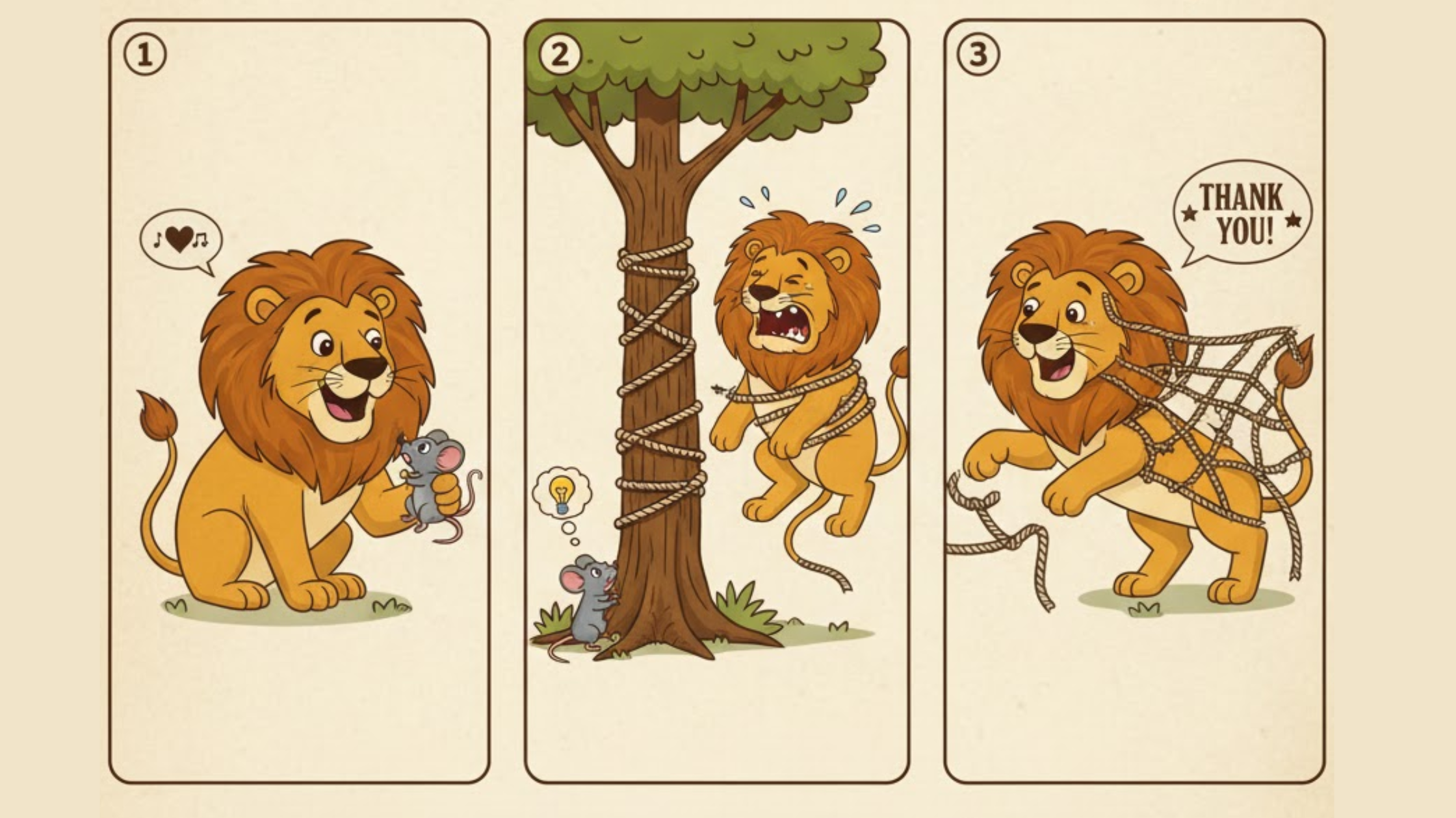 A lion lets a tiny mouse go free, and the lion used to make fun of the mouse as he was small and did not have power like the lion and later, when the lion is trapped in a net, the mouse comes to his rescue and saves the life of the lion.