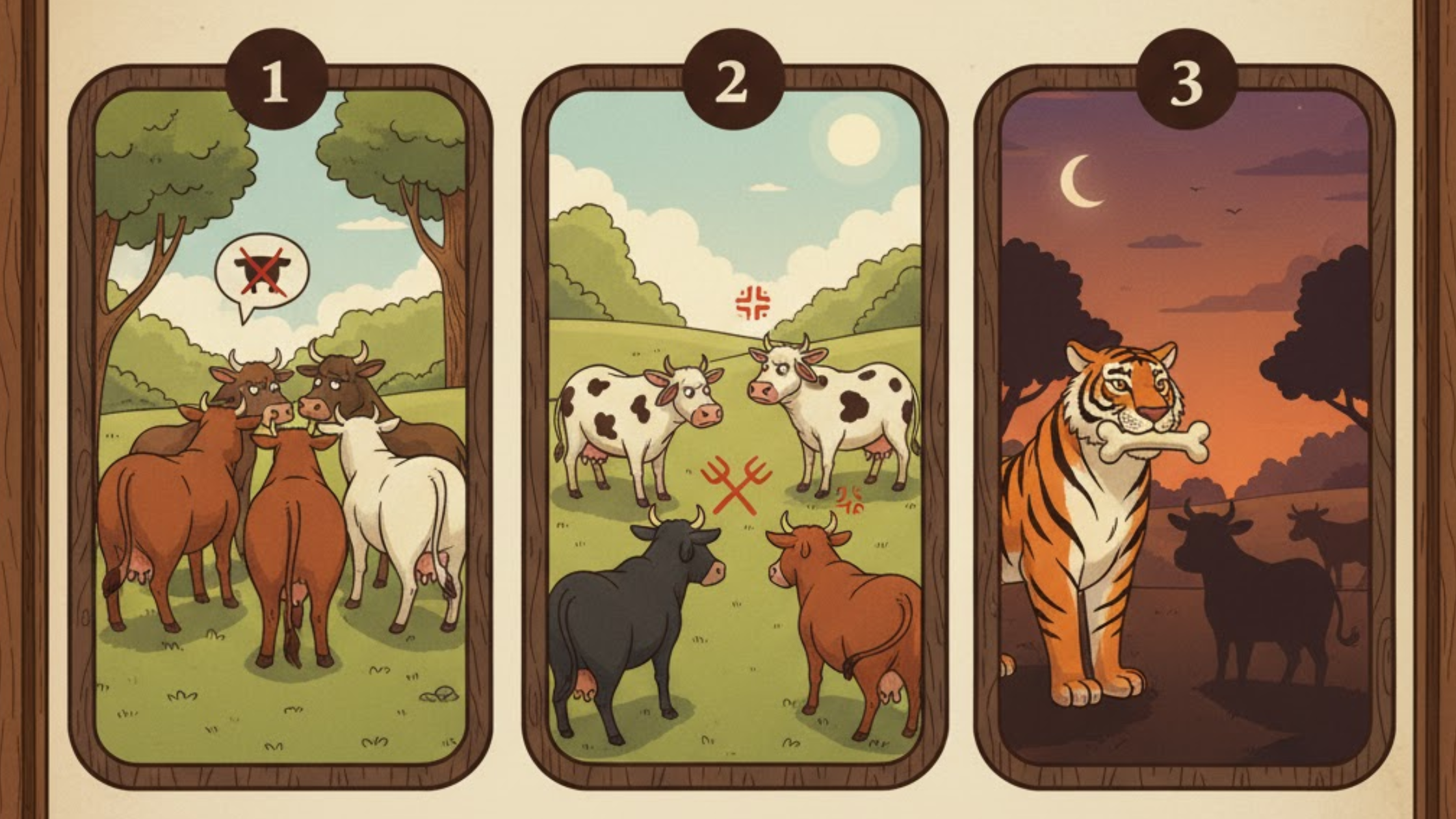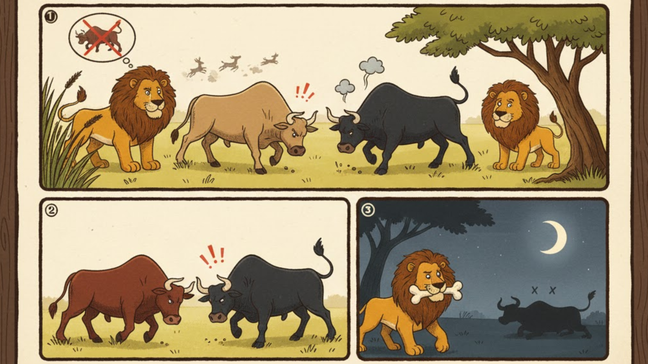 Three bulls are friends and stay together. Everyone is scared of them in the jungle, but when they fight with each other, a lion takes advantage of their division and eats them one by one.