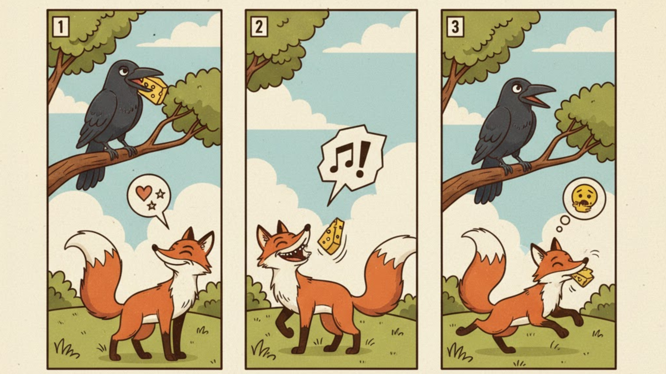 A hungry crow finds a piece of cheese nearby. A fox sees him, and as he was also hungry, he uses his clear mind, and the fox flatters him into singing, causing him to drop the cheese, and the fox grabs the cheese and runs away.