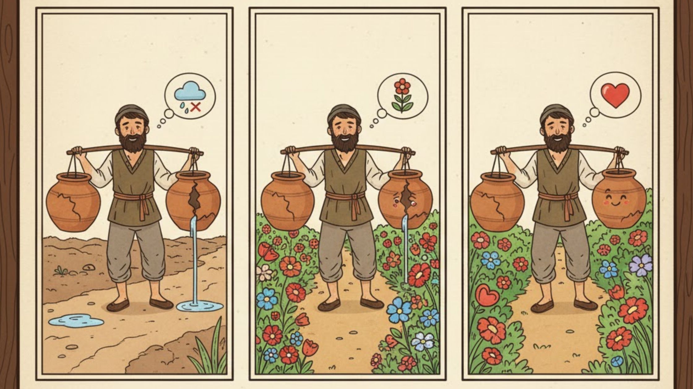 A water carrier had two pots, but one had a crack on it. Every time he carried water, some would leak out from that crack. The cracked pot felt bad about itself until it realized the spilled water had helped flowers grow along the path leading to a greener area, adding beauty to the carrier’s journey.
