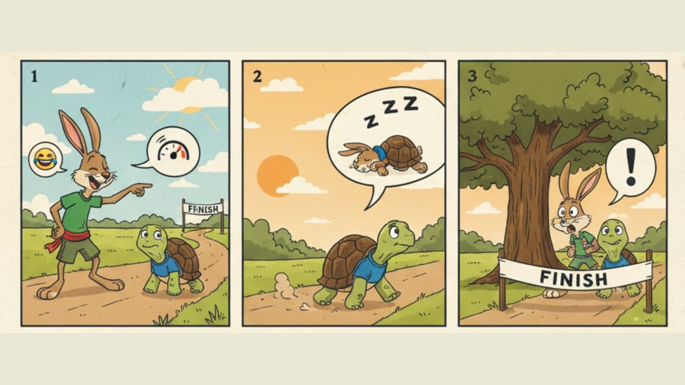 A fast hare mocks the slow tortoise and challenges him to a race. The hare gets overconfident and naps during the race, while the tortoise keeps moving steadily and wins due to his consistent efforts.