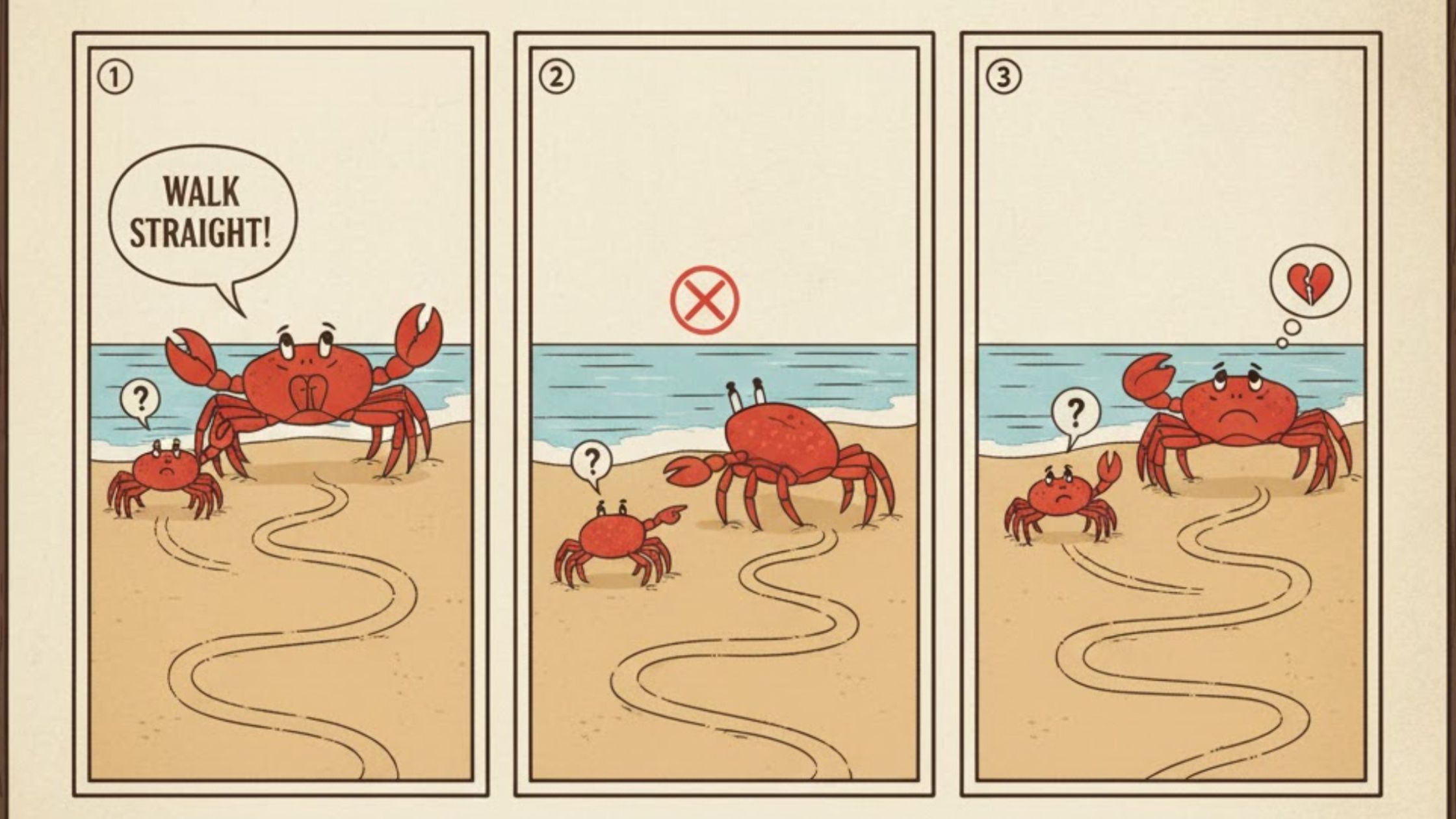 A mother crab advised her child to walk straight, but she couldn’t do so herself, and her child was mimicking what she was doing.