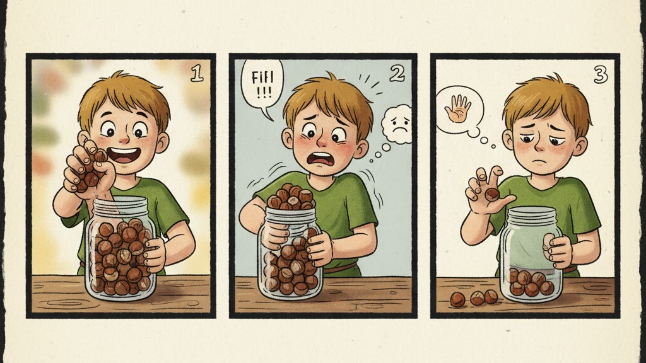 A boy reaches into a jar for filberts, but when he grabs too many, his hand gets stuck and here was no one to help him. And after sometime he’s forced to let go of someone to free himself.