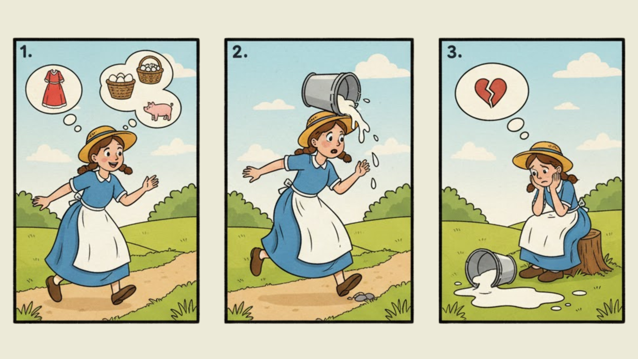 Molly the milkmaid dreams of all the things she will buy with the money from selling milk all day, but when she daydreams too much, she spills the milk by mistake.