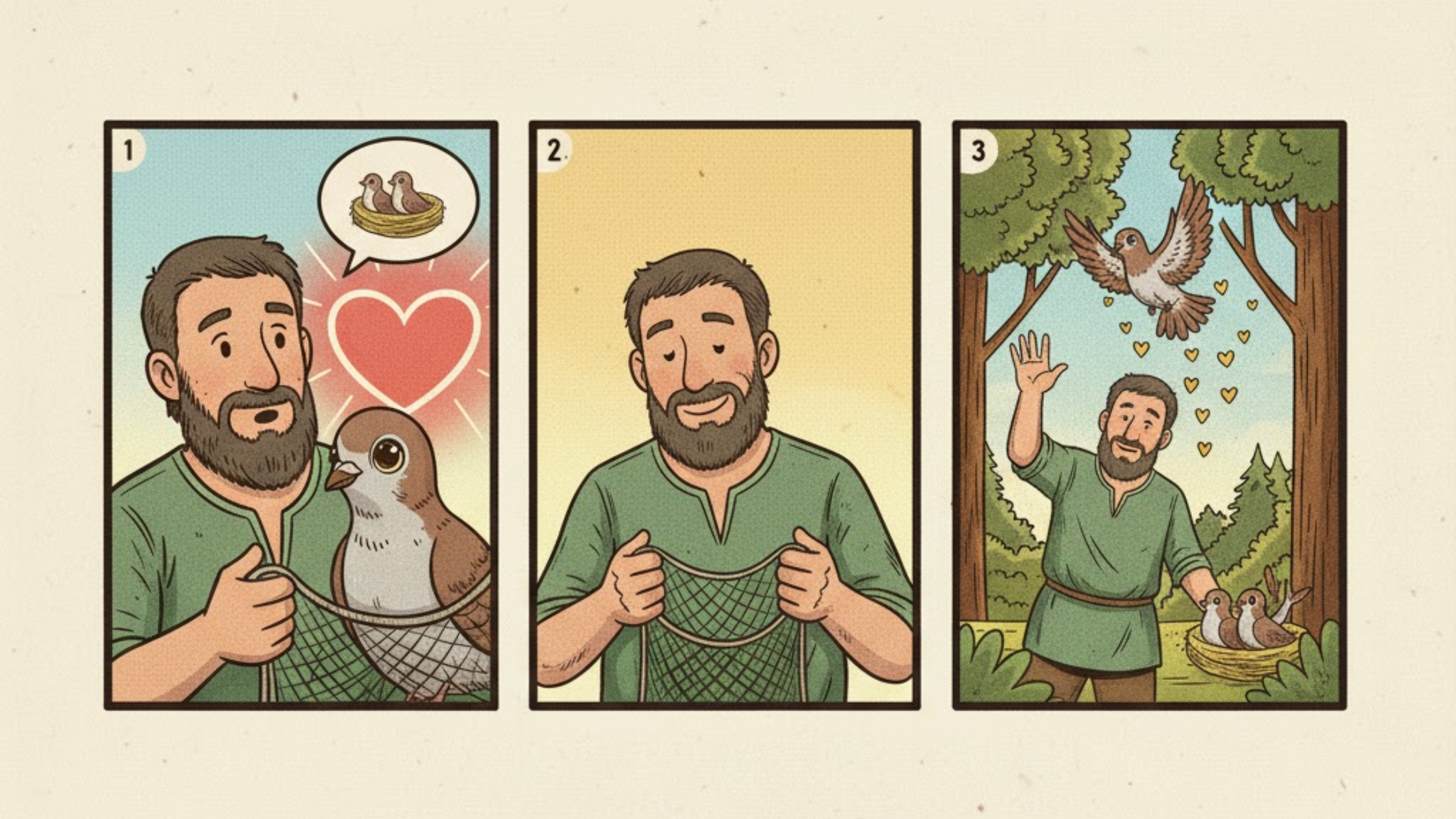 One day, a hunter caught a pigeon in a net, but the pigeon didn’t panic and stayed calm. She calmly asked the hunter to let her go, as her small kids were waiting for her, promising she’d show her gratitude. The hunter was touched by her kind words and freed her.
