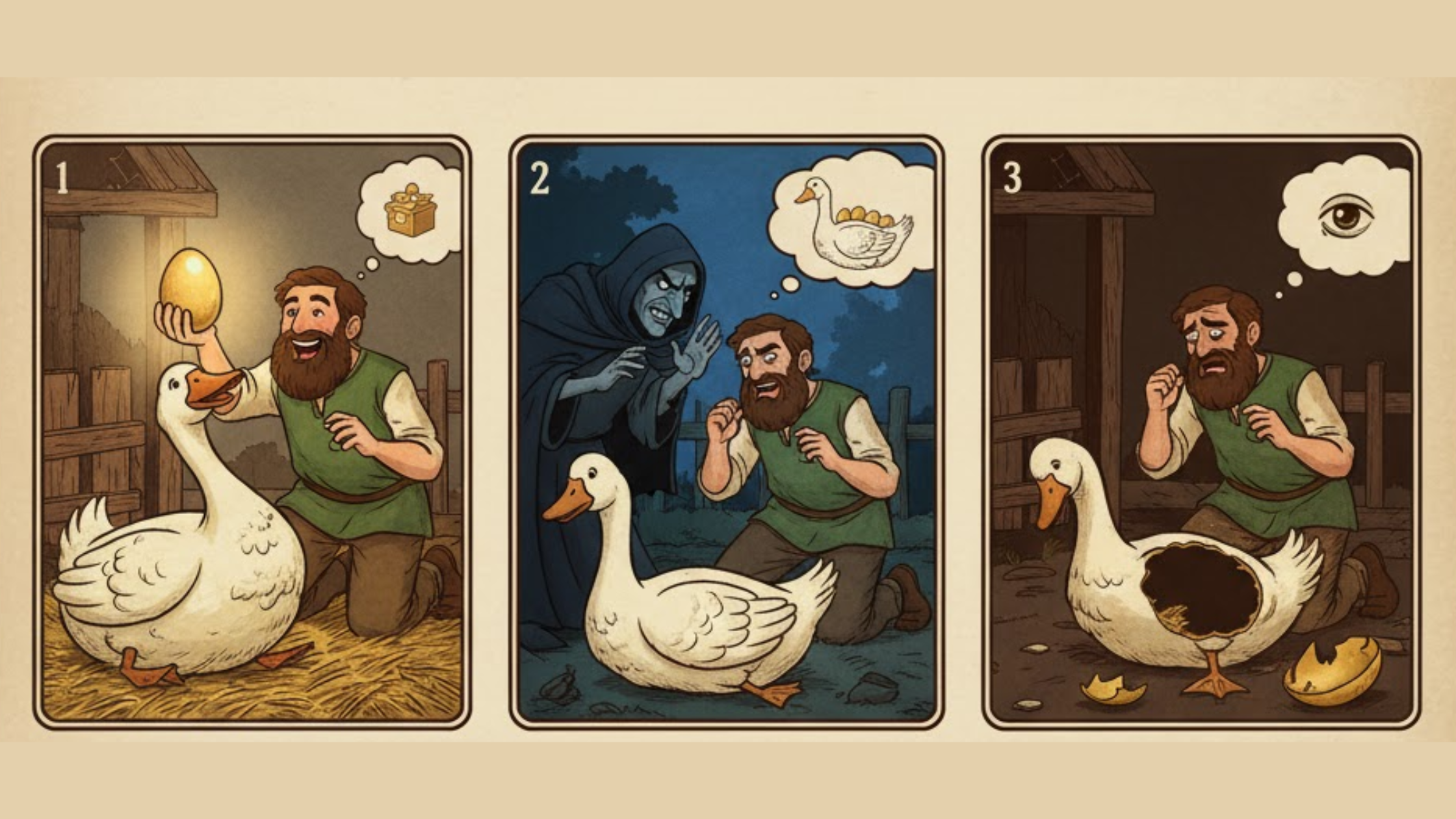 A farmer’s goose lays golden eggs every day, giving him eggs daily, but when the enemy of the farmer suggested he cut the hen and get all the eggs once easily instead of waiting to get one egg every day, he gets greedy. After listening to him, and he decides and cuts the hen and opens it for more, he loses everything.