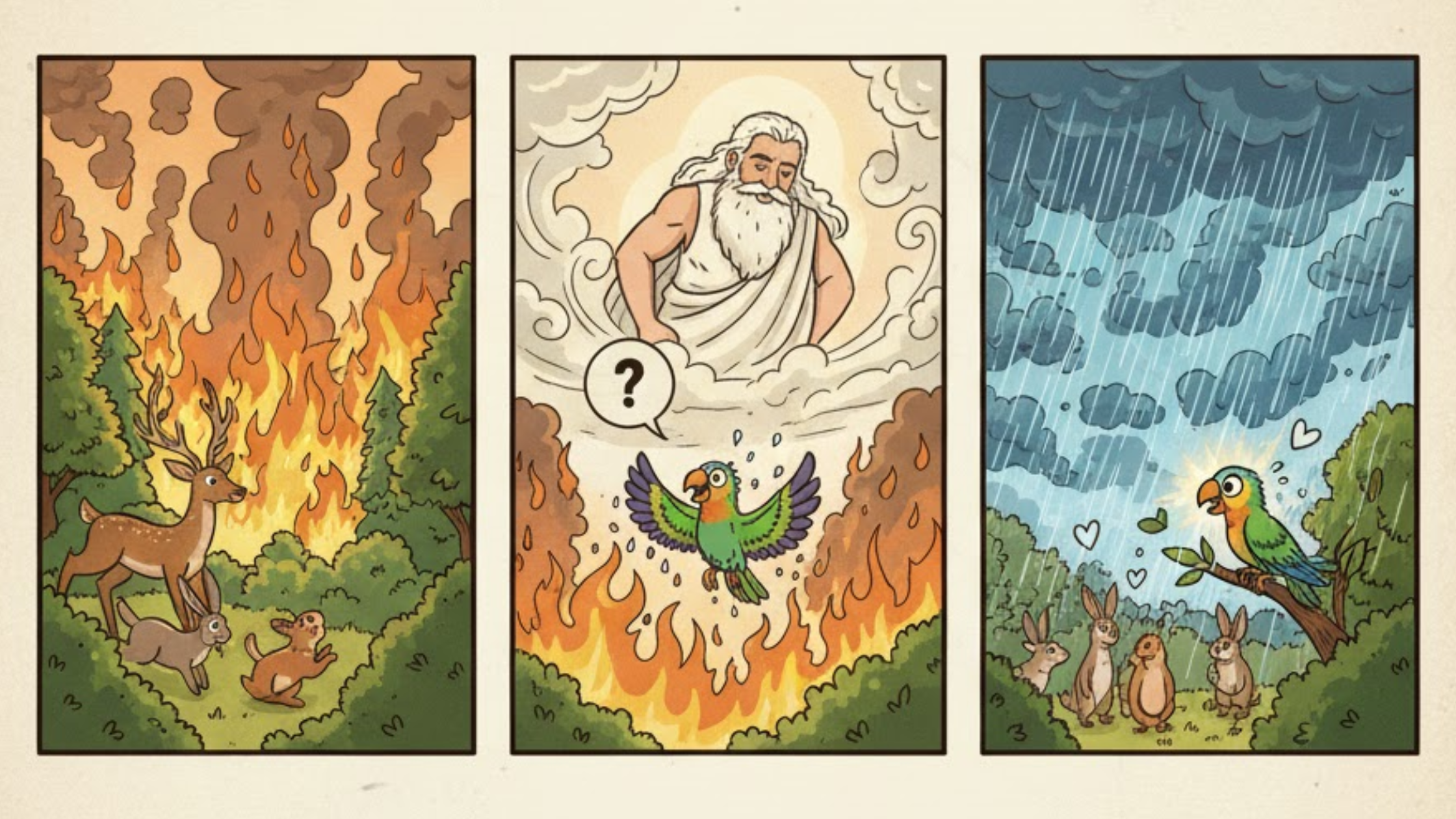 A forest caught fire, and all the animals ran away. But one little parrot decided to help. She flew to a river, carried drops of water in her wings, and dropped them on the fire. Seeing her bravery, the gods sent rain to put out the fire.