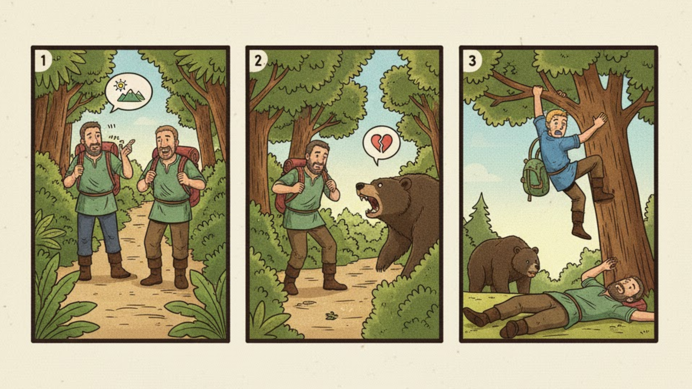 There were two best friends who decided to go for tracking in a jungle. They were very confident. Suddenly they saw a bear coming their way, they both got scared, and one friend abandoned the other when a bear appeared, revealing his cowardice.