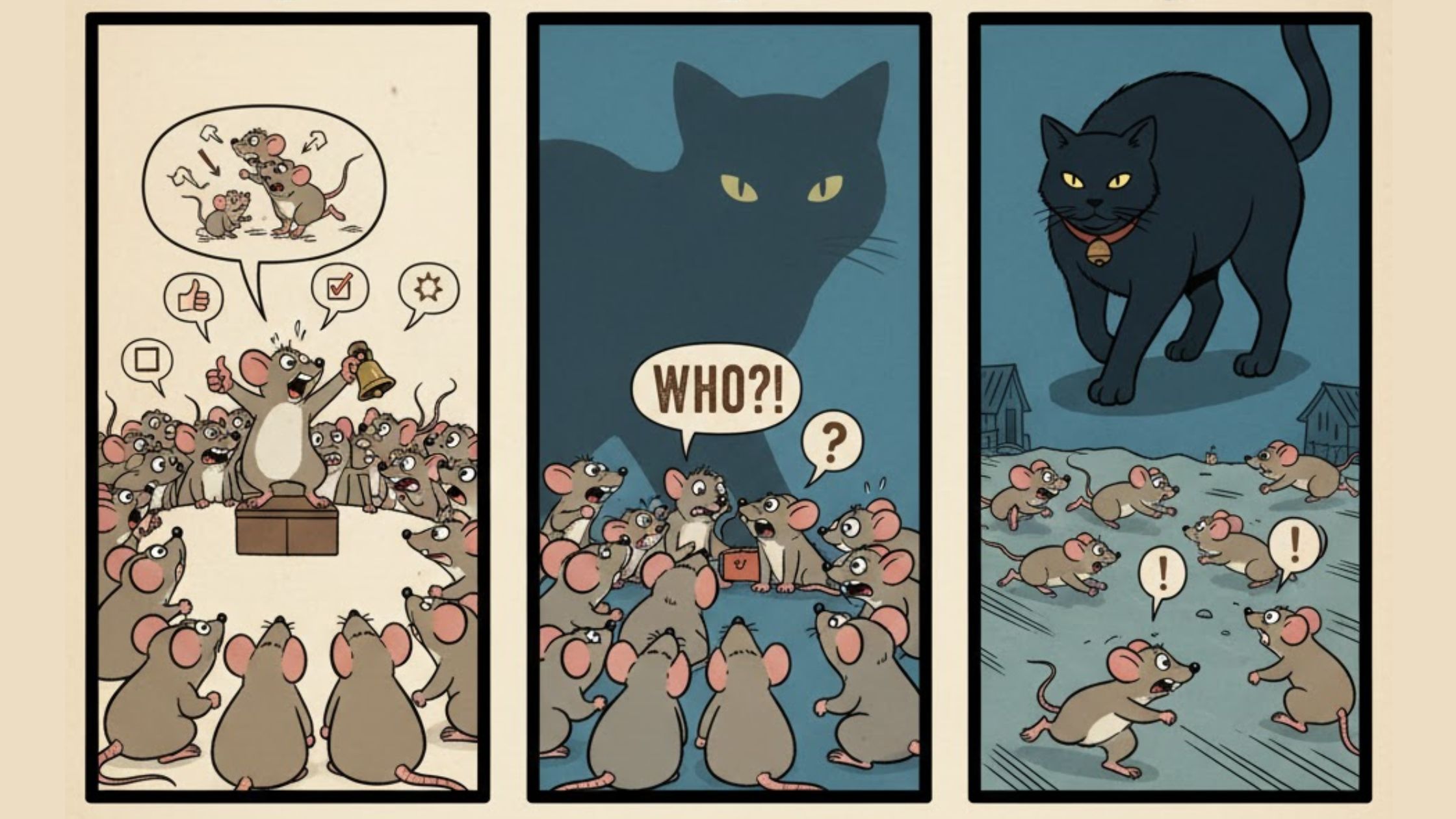Mice decided to bell a cat so that they all would get to know that the cat is coming to attack them, and he motivated every mouse in his group and made everyone agree but hesitated on who would do it.