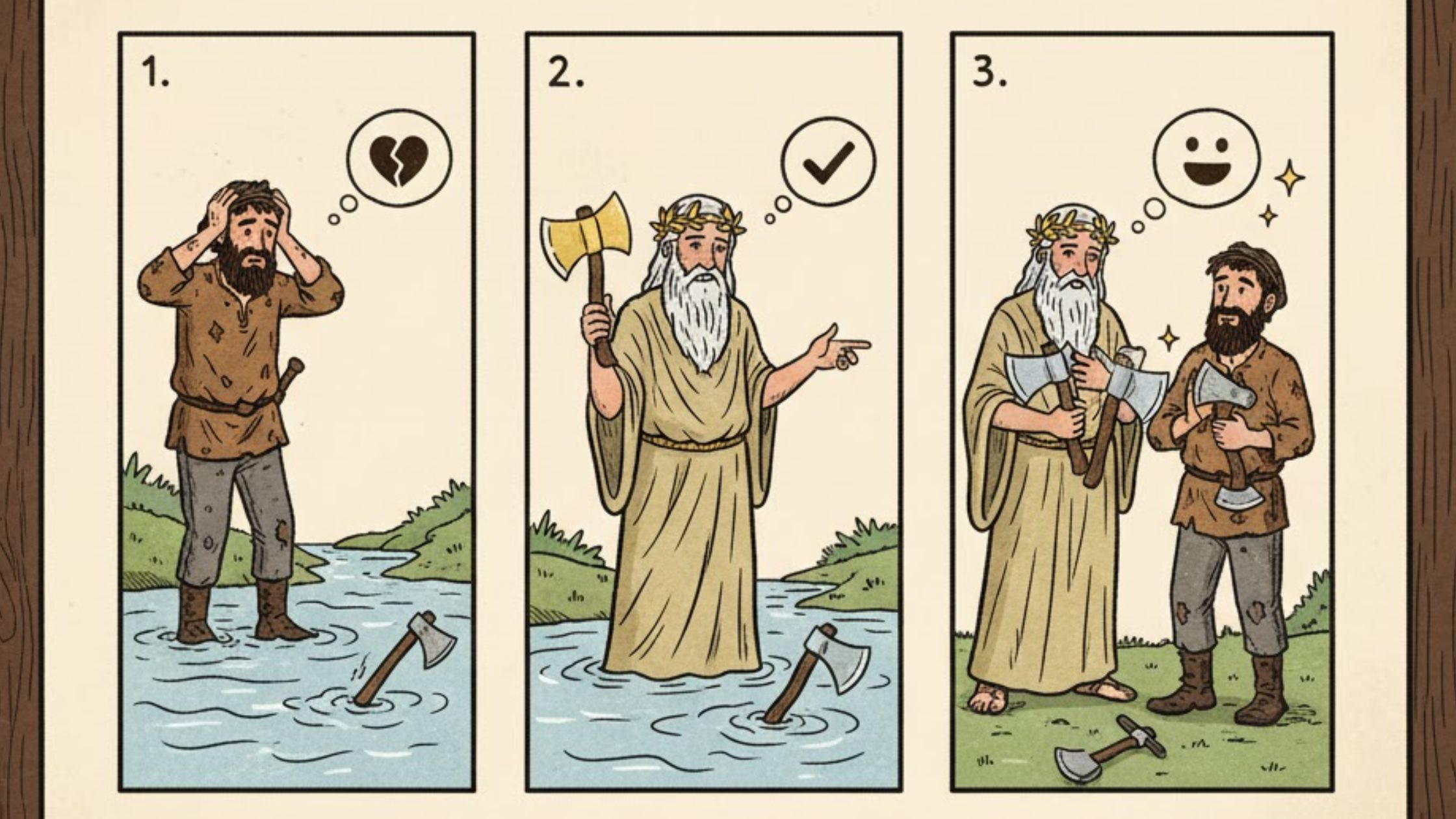 A woodcutter’s honesty earned him rewards from the god. The woodcutter was rewarded with both silver and golden axes for his honesty.