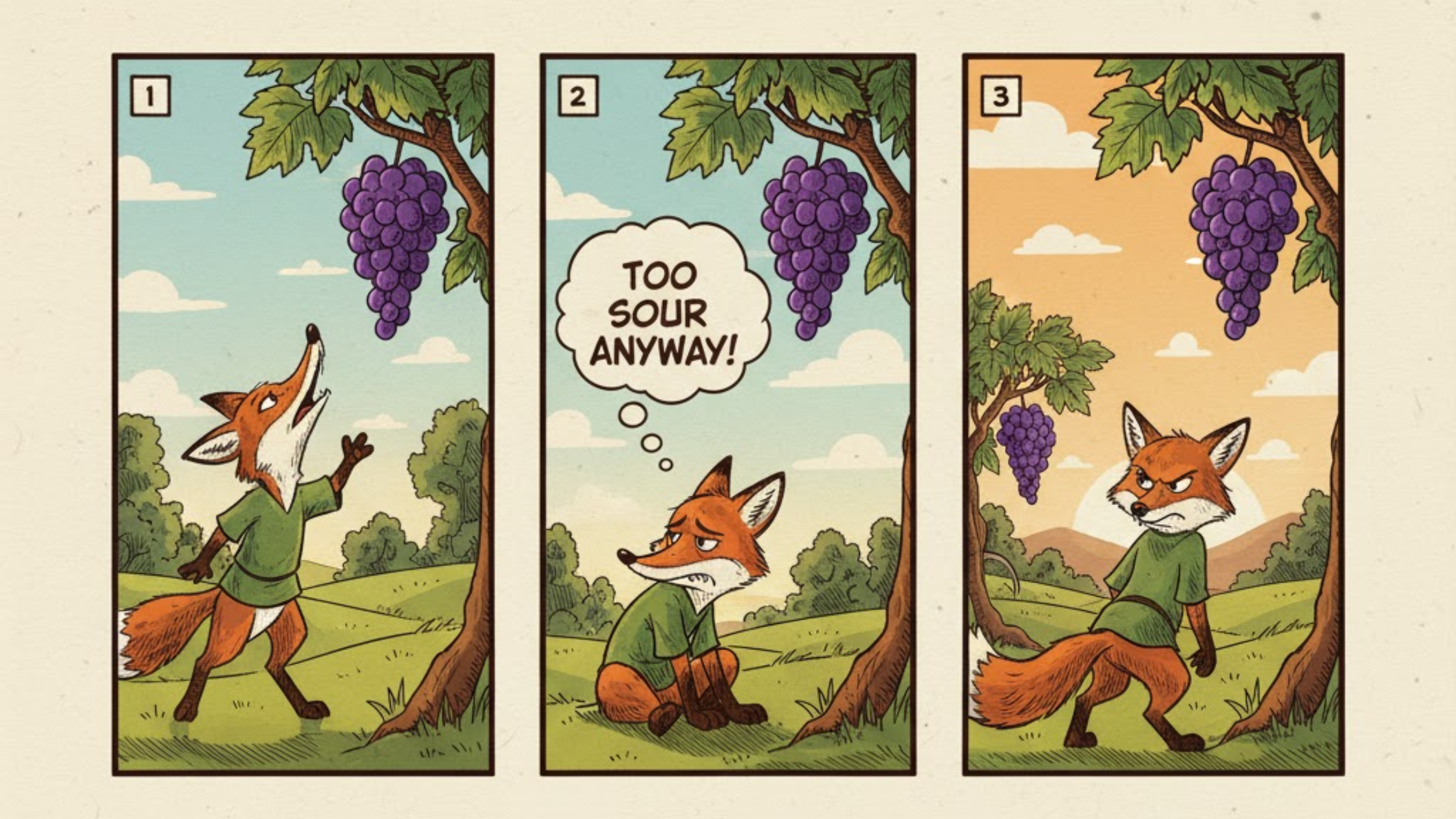 A hungry fox tries and fails to reach a bunch of grapes hanging high on a vine. He thinks about them as he is hungry, but as he is unable to reach them, he decides to walk away, convinced they were sour anyway.