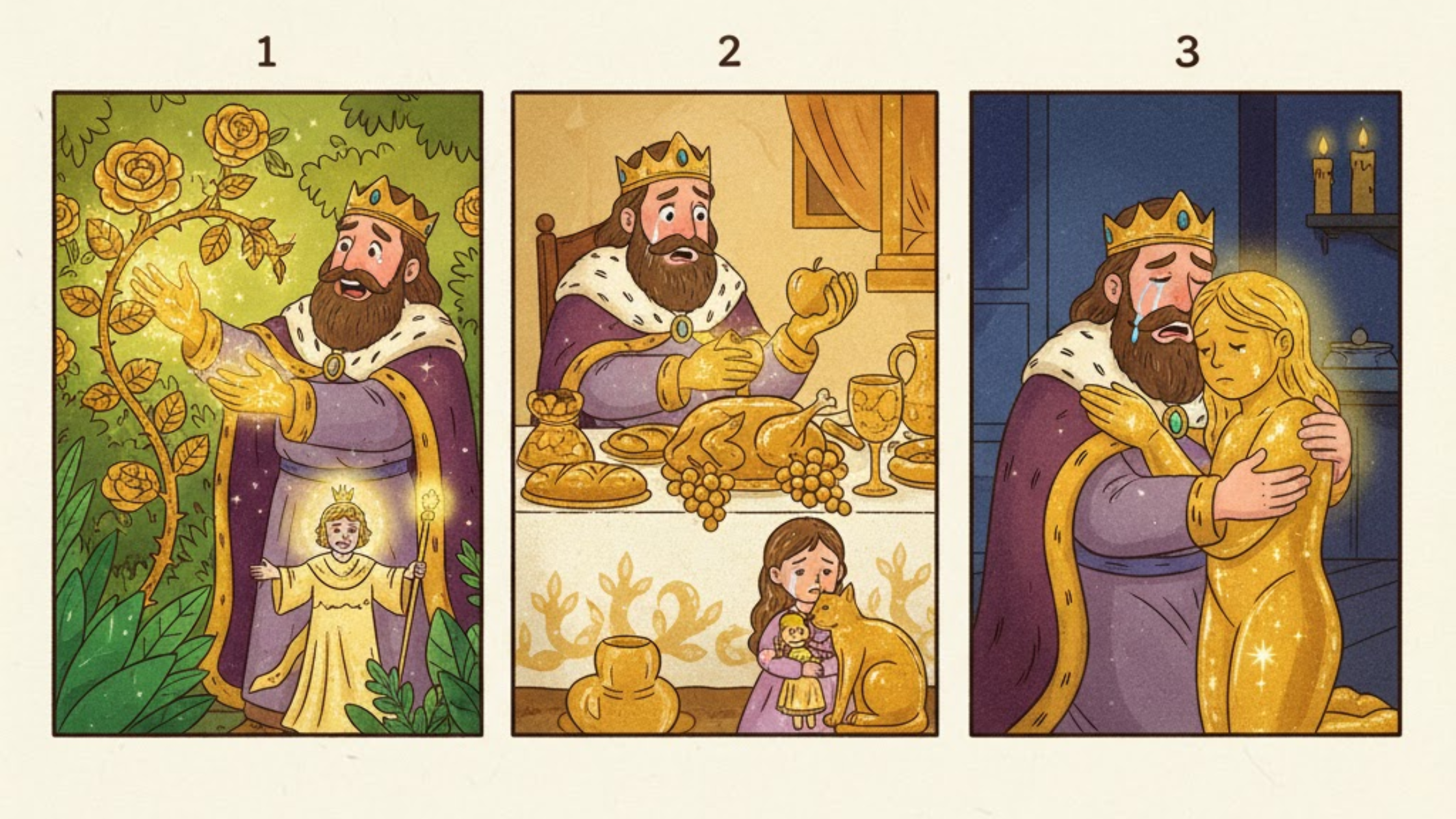 Once upon a time there was a king Midas, he gets a wish fulfilled that everything he touches can turn into gold - anything. After getting this power his greed started to rise everything he touched become of gold, after some time this wish became a curse, as he couldn’t eat and touch or hug his loved ones. Making him understand that his greed made him not get happiness from life.