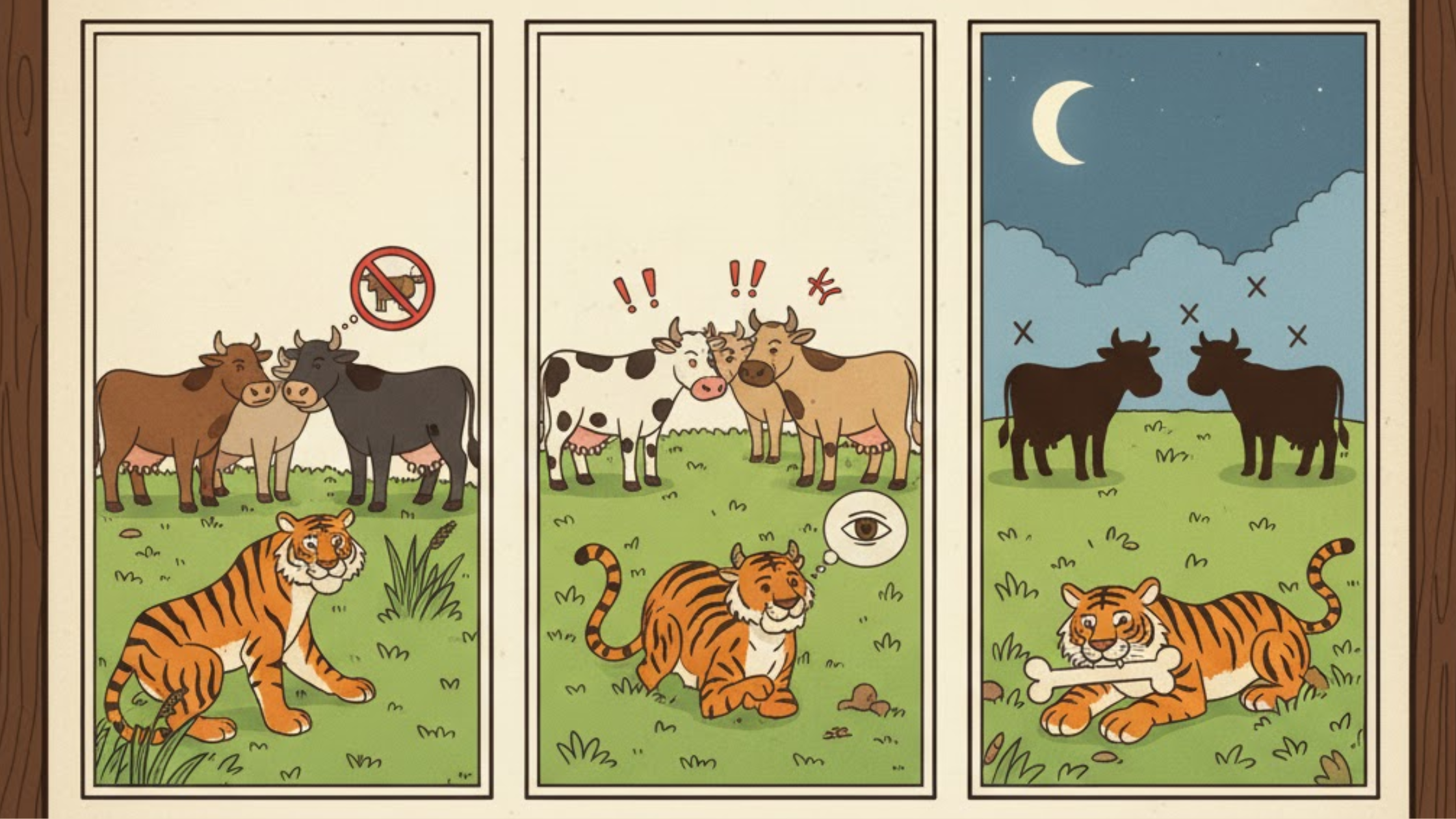 There was a hungry tiger who wanted to eat cows in a village. Suddenly one day he found a group of 4 cows, but he was unable to eat them as they always stayed in a group. Four cows were safe from the tiger when they stayed together. One day they started fighting with each other for food and went their separate ways, the tiger found the opportunity and started easily catching them one by one.