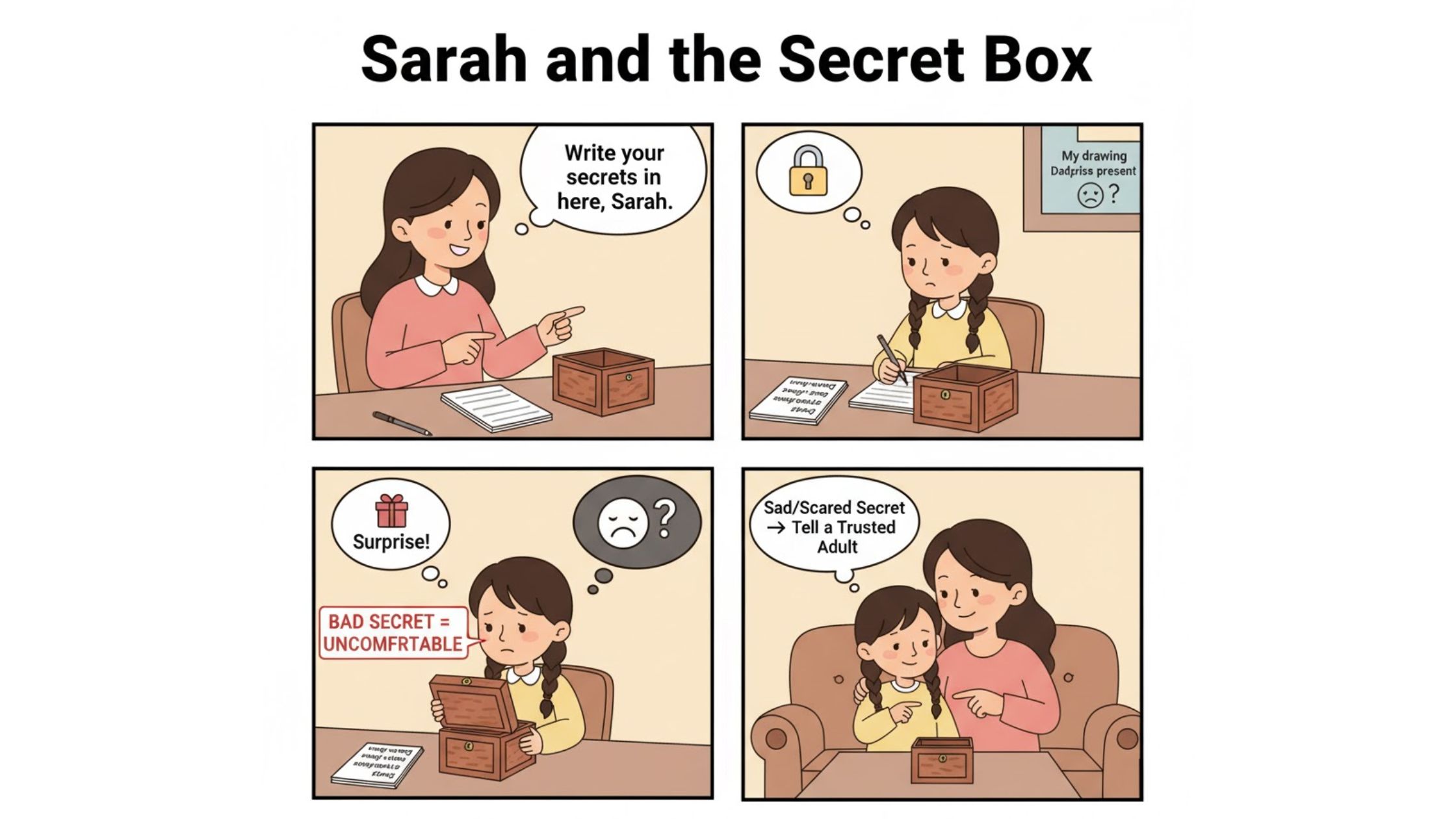 Sarah's tuition teacher gives her a task: to write the things that are secrets and that she would share only with someone she truly trusts. Sarah did the same and wrote about it. Through this activity, Sarah learns that some secrets are only shared with someone they trust, like their parents, or someone they trust like experience, which makes them feel bad, secrets, like surprises, are okay, but secrets that make her feel bad or uncomfortable should always be shared with an adult she trusts.