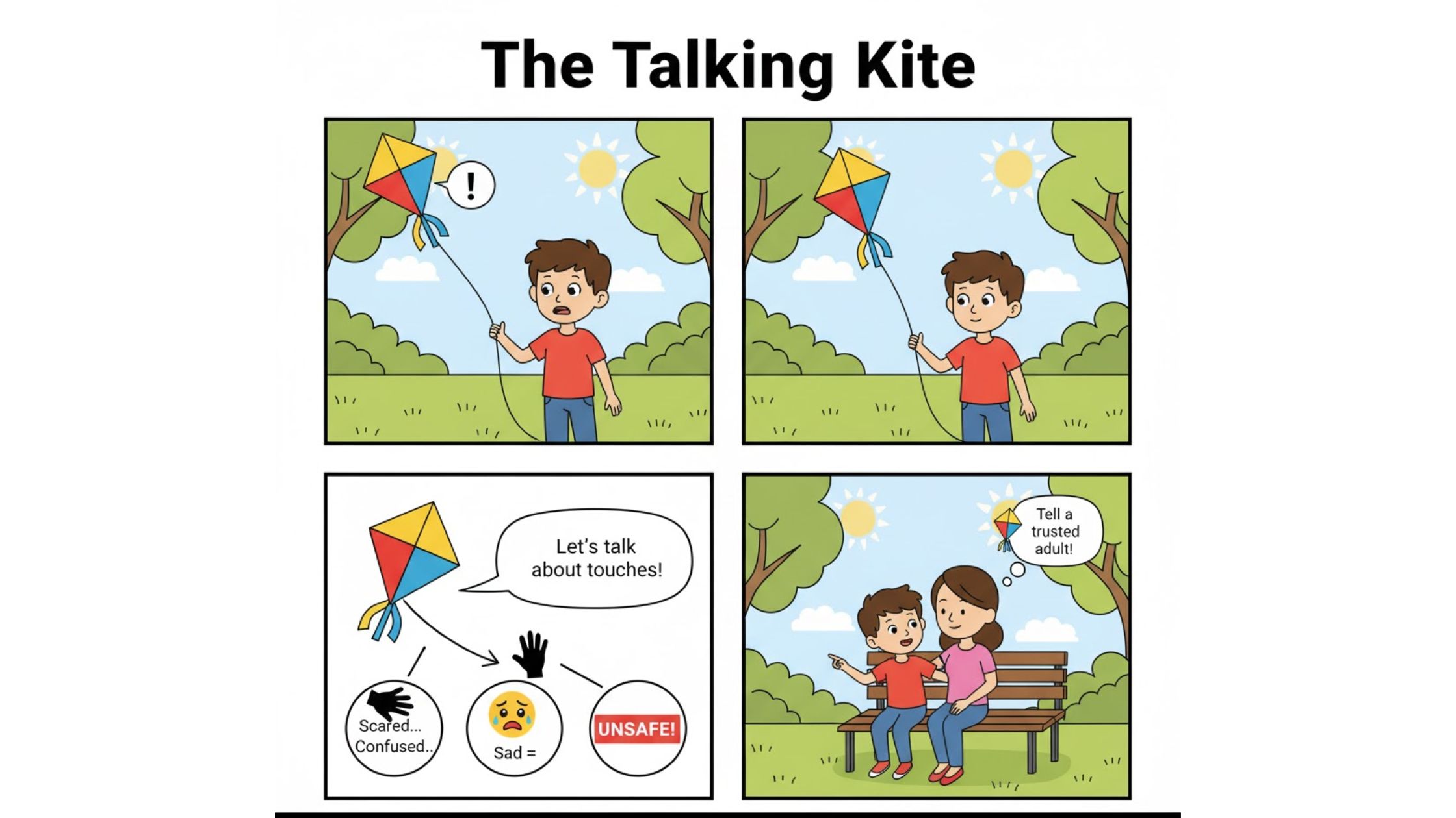 A young boy, Arjun, loves flying kites. One day, his favorite kite magically talks and teaches him about safe and unsafe touches. Arjun gets surprised and starts to talk with the kite. The kite explains that touches that make you feel scared, confused, or sad are unsafe and are bad touches and should always be shared with a trusted adult like your parents or someone nearby who can help.