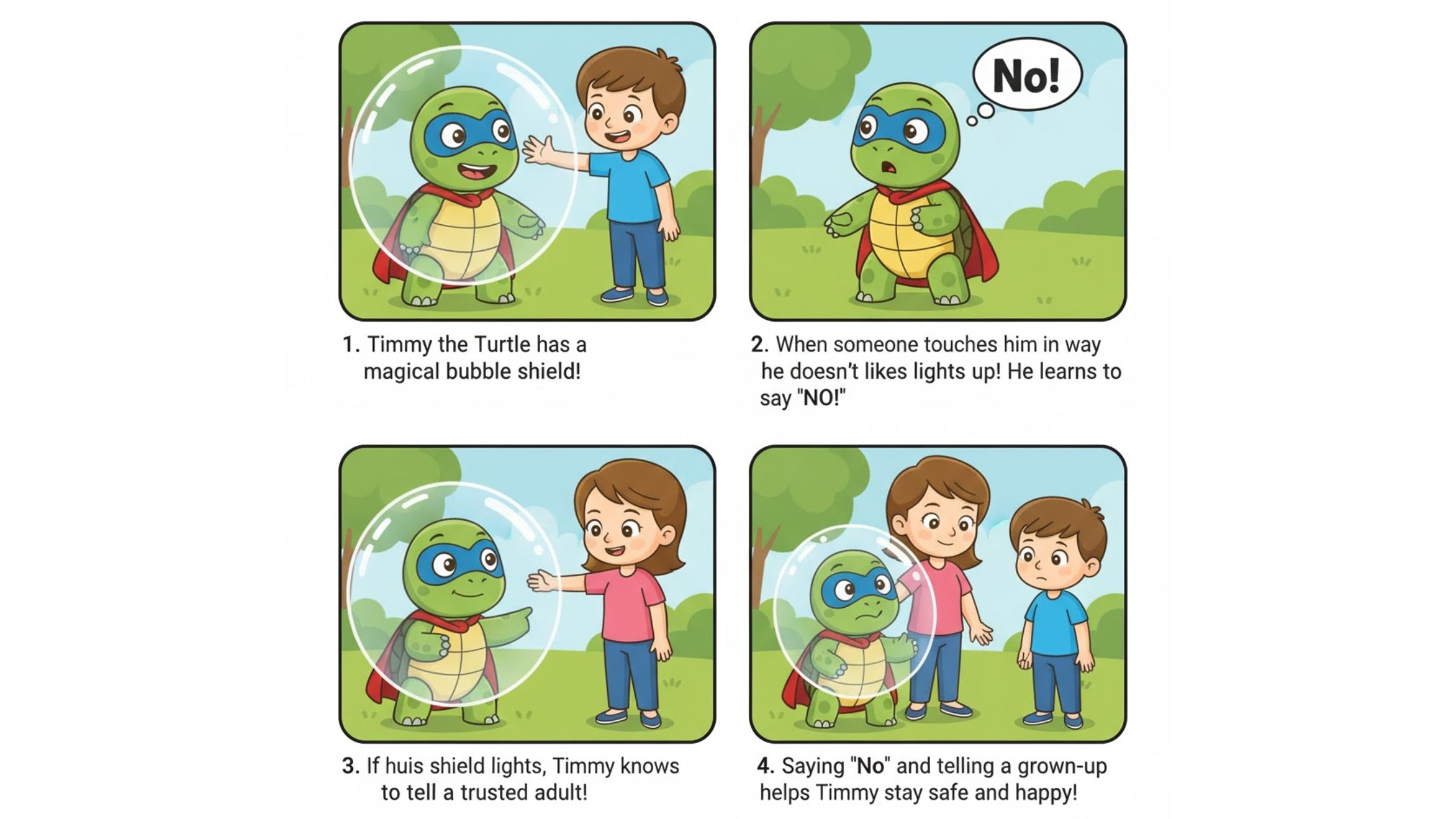 There was a superpower turtle called Timmy, having a magical bubble shield around his body. When someone tries to touch him in a way that causes him discomfort, the shield lights up. Toby learns that he can say “No” and tell a trusted adult if the bubble shield lights up.